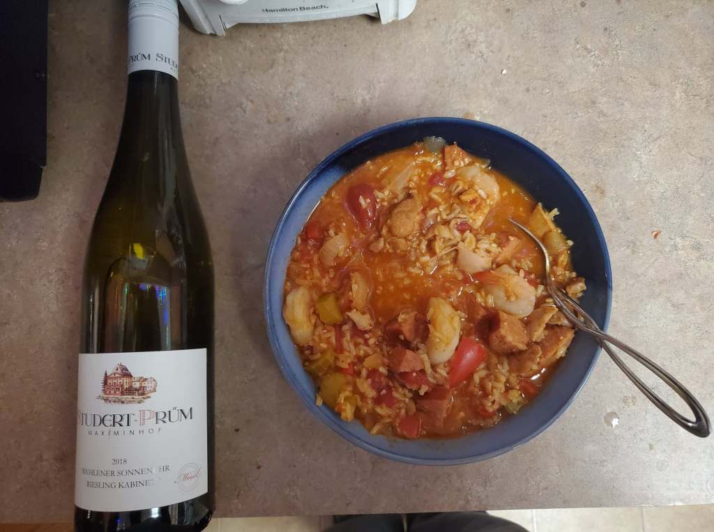 Ain’t this a beauty? The missus was in the mood for jambalaya yesterday, it’s one of our favorite dishes even though Carleen hates shrimp. If you’re wondering, I cook the shrimp separately and add it to my bowl so she doesn’t have to worry about any “surprises”. At any rate I was looking for a good wine to pair with this dish when I saw an internet article recommending a Riesling Kabinett from the Mosel region. “Aha!” I thought to myself. Just so happened Carleen bought me a Riesling Kabinett from that exact region a few weeks ago, and had been anxious to try it, especially after trying the “Sweet Riesling” from American Vintners yesterday. Could she had planned this all along? Hmmm…