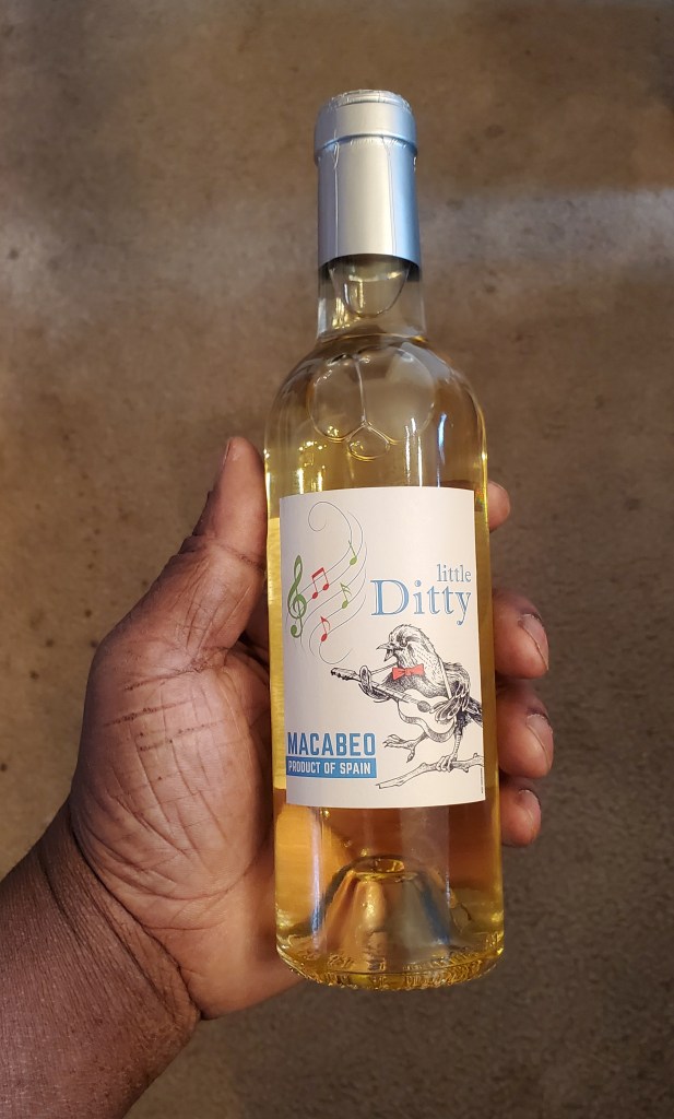 Day 15’s wine is a Macabeo from Spain. The Macabeo grape (also known as Viura in Rioja) is usually blended with other grapes to make Cava, so a still wine like Little Ditty featuring Macabeo like is a bit of a rara avis (no pun intended on the label) which my wife and I were looking forward to taste.