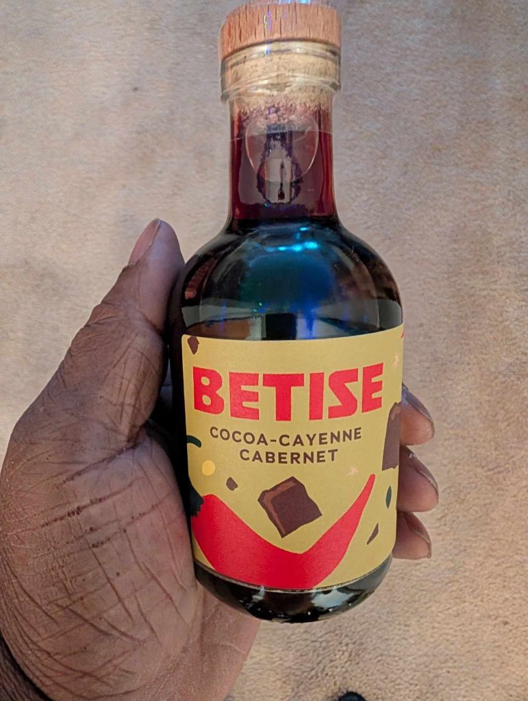 So far, I haven’t been able to find either of the Betise wines (Spicy Rose’ or the Cocoa Cayenne Cabernet) outside of In Good Taste’s website, particularly the calendar. So it looks like you have to order it through IGT, probably as part of a mini-flight set since they don’t seem to sell single 750 ml bottles.